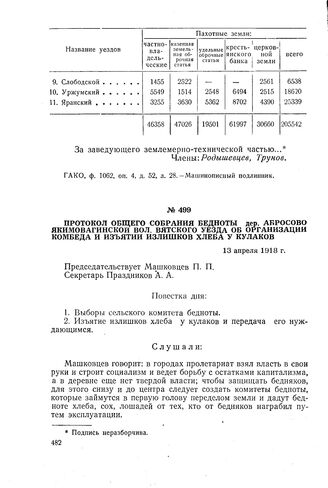 Протокол общего собрания бедноты дер. Абросово Якимовагинской вол. Вятского уезда об организации комбеда и изъятии излишков хлеба у кулаков. 13 апреля 1918 г.