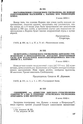 Постановление Слободского уисполкома по поводу сопротивления населения с. Карино при реквизиции хлеба. 3 июня 1918 г. // ГАКО, ф. 884, оп. 1. д. 27, л. 71 об. Машинописная копия.