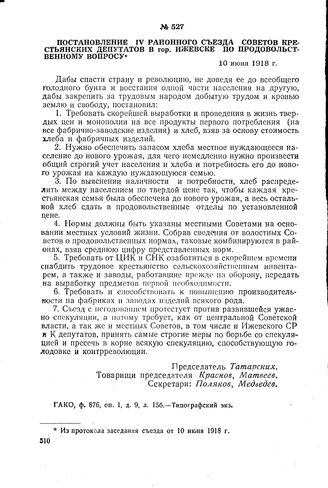 Постановление IV районного съезда Советов крестьянских депутатов в гор. Ижевске по продовольственному вопросу. 10 июня 1918 г.