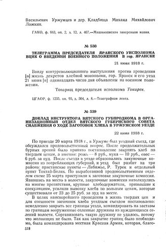 Телеграмма председателя Яранского уисполкома ВЦИК о введении военно...