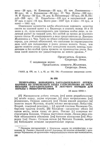 Телеграмма командира заградительного отряда Карпова из Уржумского уезда Губисполкому об организации заградительных и летучего отрядов для борьбы с мешочничеством. 24 июля 1918 г. // ГАКО, ф. 876, оп. 1, д. 4, лл. 455-459. Телеграфный бланк.
