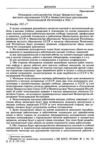 Приложение к записке отдела науки и вузов ЦК КПСС от 9 января 1956 г. Принципы сотрудничества между Министерством высшего образования СССР и Министерством образования Чехословацкой республики в 1956 г. 15 декабря 1955 г. // ГА РФ. Ф. Р-9396. Oп. 10. Д. 16. Л. 1-3. Копия.