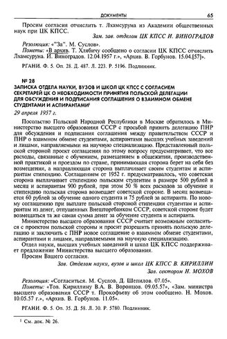 Записка отдела науки, вузов и школ ЦК КПСС с согласием секретарей ЦК о необходимости принятия польской делегации для обсуждения и подписания соглашения о взаимном обмене студентами и аспирантами. 29 апреля 1957 г.