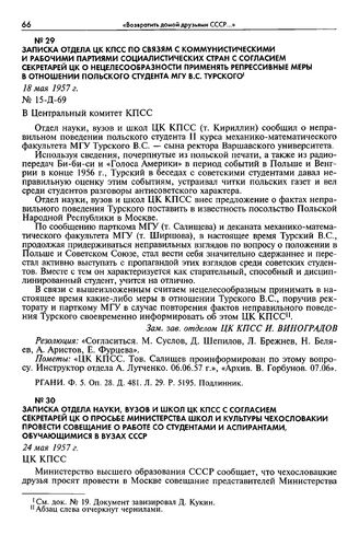 Записка отдела науки, вузов и школ ЦК КПСС с согласием секретарей ЦК о просьбе Министерства школ и культуры Чехословакии провести совещание о работе со студентами и аспирантами, обучающимися в вузах СССР. 24 мая 1957 г.