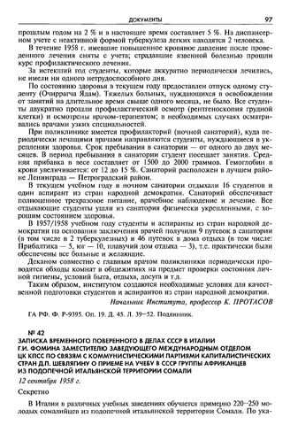 Записка временного поверенного в делах СССР в Италии Г. И. Фомина заместителю заведующего международным отделом ЦК КПСС по связям с коммунистическими партиями капиталистических стран Д. П. Шевлягину о приеме на учебу в СССР группы африканцев из подопечной итальянской территории Сомали. 12 сентября 1958 г. // РГАНИ. Ф. 11. Oп. 1. Д. 317. Л. 21—23. Подлинник. Опубликовано: Россия и Африка. С. 331-332.