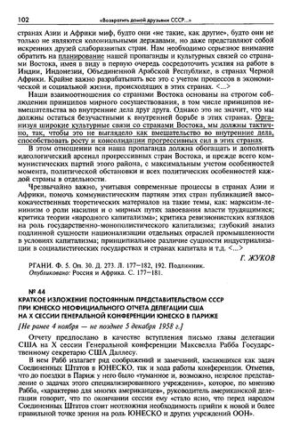 Краткое изложение постоянным представительством СССР при ЮНЕСКО неофициального отчета делегации США на Х сессии Генеральной конференции ЮНЕСКО в Париже. [Не ранее 4 ноября — не позднее 5 декабря 1958 г.]