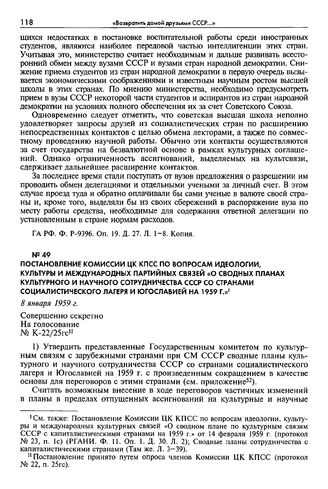 Постановление комиссии ЦК КПСС по вопросам идеологии, культуры и международных партийных связей «О сводных планах культурного и научного сотрудничества СССР со странами социалистического лагеря и Югославией на 1959 г.» 8 января 1959 г. Совершенно ...