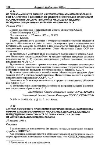 Записка постоянного представителя СССР при ЮНЕСКО А. Г. Кулаженкова первому заместителю министра иностранных дел СССР В. В. Кузнецову и председателю комиссии СССР по делам ЮНЕСКО Г. А. Жукову об улучшении работы представительства. 20 августа 1959 г. Секретно // ГА РФ. Ф. Р-9519. Oп. 2. Д. 14. Л. 46—56. Подлинник.