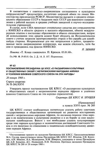 Постановление Президиума ЦК КПСС «О расширении культурных и общественных связей с негритянскими народами Африки и усилении влияния Советского Союза на эти народы». 20 января 1960 г. Строго секретно // РГАНИ. Ф. 3. Оп. 14. Д. 354. Л. 1, 73—77. Подлинник. Опубликовано: Россия и Африка. С. 181—184.