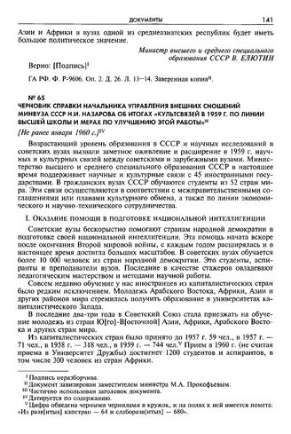 Черновик справки начальника Управления внешних сношений Минвуза СССР Н. И. Назарова об итогах «Культсвязей в 1959 г. по линии Высшей школы и мерах по улучшению этой работы». [Не ранее января 1960 г.] // ГА РФ. Ф. Р-9606. Oп. 1. Д. 166. Л. 4-17. Копия.