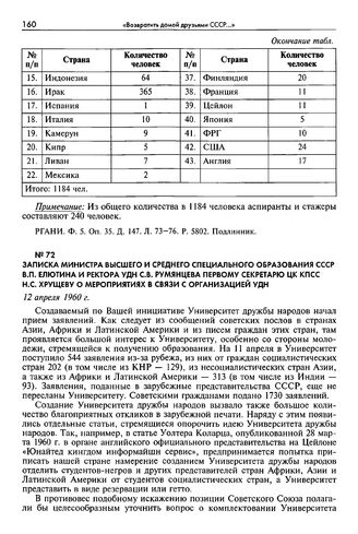 Записка министра высшего и среднего специального образования СССР В. П. Елютина и ректора УДН С. В. Румянцева первому секретарю ЦК КПСС Н. С. Хрущеву о мероприятиях в связи с организацией УДН. 12 апреля 1960 г.