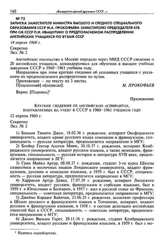 Записка заместителя министра высшего и среднего специального образования СССР М. А. Прокофьева заместителю председателя КГБ при СМ СССР П. И. Ивашутину о предполагаемом распределении английских учащихся по вузам СССР. 14 апреля 1960 г. Секретно