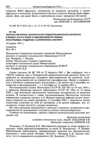 Записка Ректората Таганрогского радиотехнического института в Минвуз СССР и РСФСР о невозможности приема иностранных студентов и аспирантов в Институт. 10 марта 1961 г. Секретно // ГА РФ. Ф. Р-9606. Oп. 2. Д. 43. Л. 72. Подлинник.
