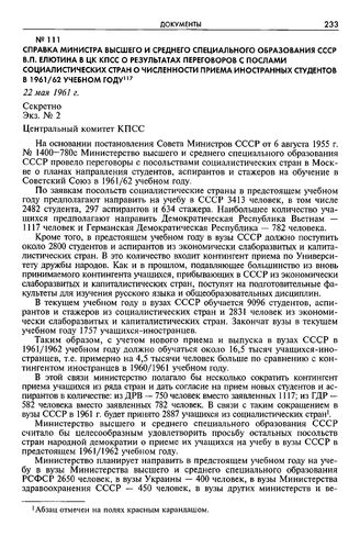 Справка министра высшего и среднего специального образования СССР В. П. Елютина в ЦК КПСС о результатах переговоров с послами социалистических стран о численности приема иностранных студентов в 1961/62 учебном году. 22 мая 1961 г. Секретно // ГА РФ. Ф. Р-9606. Oп. 2. Д. 30. Л. 96—98. Заверенная копия.