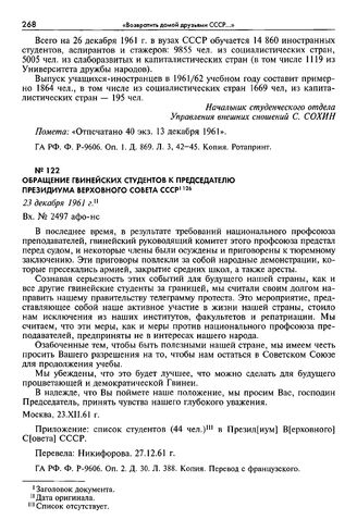 Обращение гвинейских студентов к председателю Президиума Верховного Совета СССР. 23 декабря 1961 г. // ГА РФ. Ф. P-9606. Oп. 2. Д. 30. Л. 388. Копия. Перевод с французского.