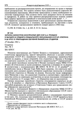 Записка министров иностранных дел СССР А. А. Громыко и высшего и среднего специального образования СССР В. П. Елютина в ЦК КПСС о прекращении обучения гвинейских студентов. 27 декабря 1961 г. Секретно