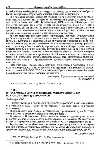 Приказ Минвуза СССР об организации методического совета по русскому языку для иностранцев. 30 декабря 1961 г.