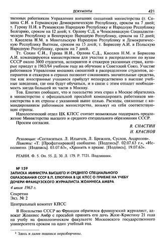 Записка министра высшего и среднего специального образования СССР В. П. Елютина в ЦК КПСС о приеме на учебу дочери французского журналиста Жоаннеса Амбра. 4 июля 1963 г. Секретно
