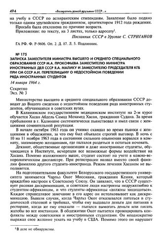 Записка заместителя министра высшего и среднего специального образования СССР М. А. Прокофьева заместителю министра иностранных дел СССР Я. А. Малику и заместителю председателя КГБ при СМ СССР А. И. Перепелицыну о недостойном поведении ряда иностранных студентов. 14 января 1964 г. Секретно // ГА РФ. Ф. Р-9606. Oп. 2. Д. 127. Л. 29—31. Заверенная копия.