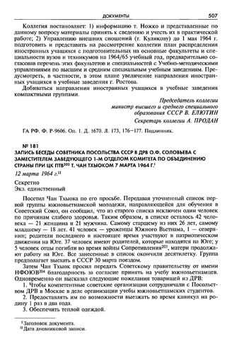 Запись беседы советника посольства СССР в ДРВ О. Ф. Соловьева с заместителем заведующего 1-м отделом Комитета по объединению страны при ЦК ПТВ т. Чан Тхыоком 7 марта 1964 г. 12 марта 1964 г. Секретно // ГА РФ. Ф. Р-9606. Oп. 2. Д. 127. Л. 178—179. Заверенная копия.
