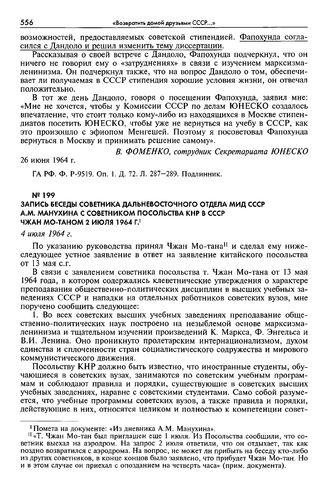 Запись беседы советника Дальневосточного отдела МИД СССР А. М. Манухина с советником посольства КНР в СССР Чжан Мо-таном 2 июля 1964 г. 4 июля 1964 г. // ГА РФ. Ф. Р-9606. Oп. 1. Д. 1955. Л. 35—39. Подлинник.