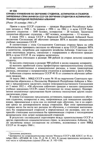 Справка Управления по обучению студентов, аспирантов и стажеров зарубежных стран Минвуза СССР об обучении студентов и аспирантов - граждан Народной Республики Албании. [Ранее 16 октября 1964 г.]