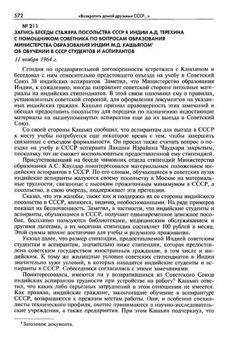 Запись беседы стажера посольства СССР в Индии А. Д. Терехина с помощником советника по вопросам образования Министерства образования Индии М. Д. Кашьяпом об обучении в СССР студентов и аспирантов. 11 ноября 1964 г.