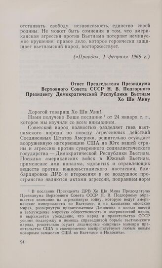 Ответ Председателя Президиума Верховного Совета СССР Н. В. Подгорного Президенту Демократической Республики Вьетнам Хо Ши Мину // «Правда», 2 февраля 1966 г.