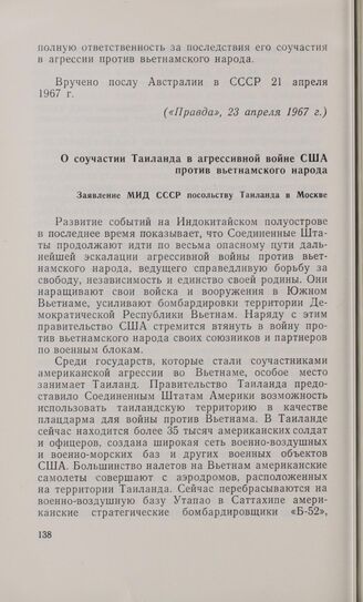 О соучастии Таиланда в агрессивной войне США против вьетнамского народа. Заявление МИД СССР посольству Таиланда в Москве. 22 апреля 1967 г.