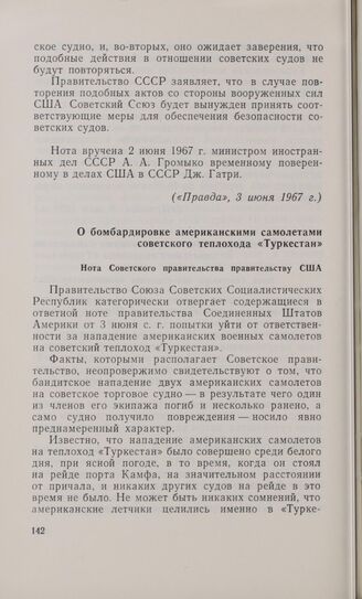 О бомбардировке американскими самолетами советского теплохода «Туркестан». Нота Советского правительства правительству США. 5 июня 1967 г. // «Правда», 6 июня 1967 г.
