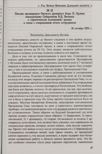 Письмо архивариуса Омского архивного бюро П. Орлова заведующему Сибархивом В.Д. Вегману о «критическом положении» архива в связи с сокращением штата сотрудников. 18 октября 1925 г.