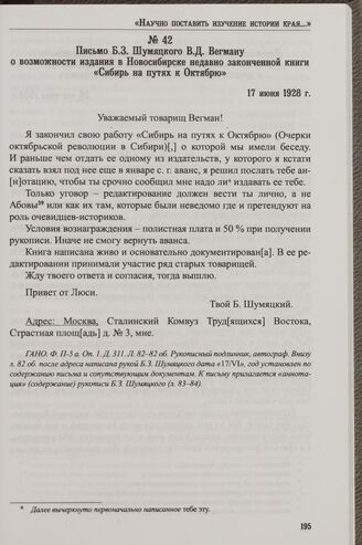 Письмо Б.З. Шумянского В.Д. Вегману о возможности издания в Новосибирске недавно законченной книги «Сибирь на путях к Октябрю». 17 июня 1928 г. // ГАНО. Ф. П -5 а. Оп. 1. Д. 311. Л. 82 -82 об. Рукописный подлинник, автограф.