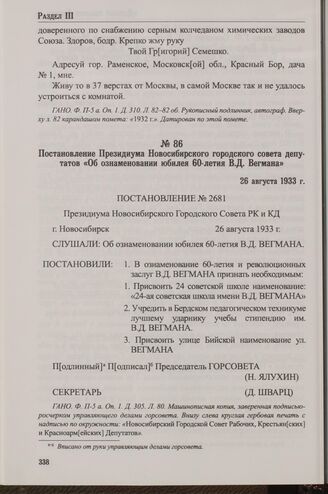 Постановление Президиума Новосибирского городского совета депутатов «Об ознаменовании юбилея 60-летия В.Д. Вегмана». 26 августа 1933 г.
