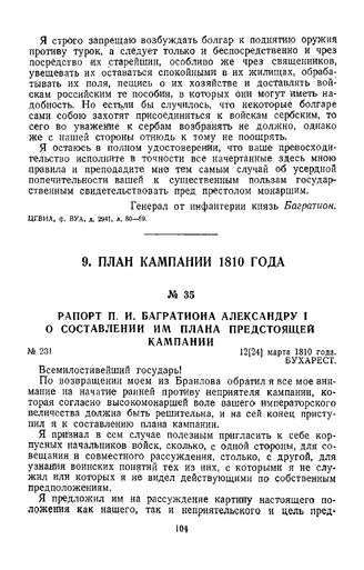1810 г. 12 марта. Рапорт П. И. Багратиона Александру I о составлении им плана предстоящей кампании // ЦГВИА, ф. ВУА, д. 2941, л. 105.