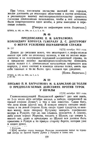1811 г. 10 октября. Предписание П. И. Багратиона командиру корпуса генералу Д. С. Дохтурову о мерах усиления пограничной стражи // ЦГВИА, ф. 103, оп. 209г, св. 1, д. 3, л. 84-85.