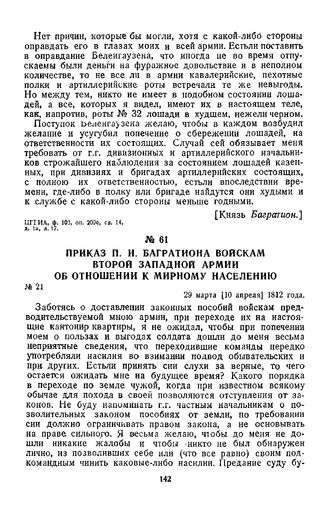 1812 г. 29 марта. Приказ П. И. Багратиона войскам второй Западной армии об отношении к мирному населению