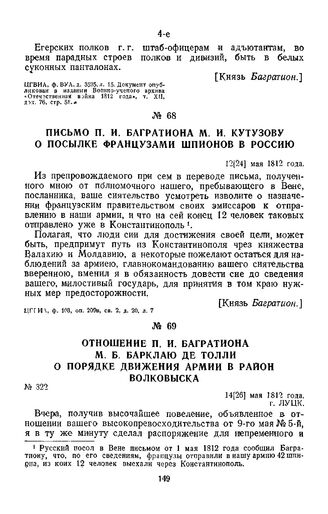 1812 г. 14 мая. Отношение П. И. Багратиона М. Б. Барклаю де Толли о порядке движения армии в район Волковыска // ЦГВИА, ф. ВУА, д. 3505, л. 300. Документ опубликован в издании Военно-ученого архива «Отечественная война 1812 года», т. XII, док. 100, стр. 86.