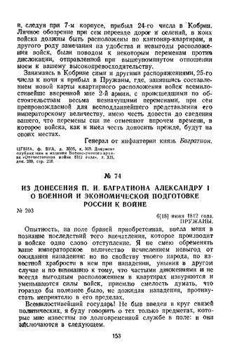 1812 г. 6 июня. Из донесения П. И. Багратиона Александру I о военной и экономической подготовке России к войне // ЦГВИА, ф. ВУА, д. 3469, л. 121-121 об., 122-122 об., 123-123 об. Документ опубликован в издании Военно-ученого архива «Отечественная война 1812 года», т. XII, док. 57, стр. 78.