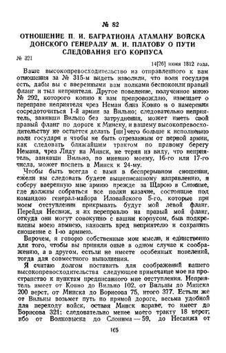 1812 г. 14 июня. Отношение П. И. Багратиона атаману Войска Донского генералу М. И. Платову о пути следования его корпуса // ЦГВИА, ф. ВУА, д. 3507, л. 219- 220. Документ опубликован в сборнике Д. П. Ахлестышева «Двенадцатый год», Спб, 1912, стр. 38.