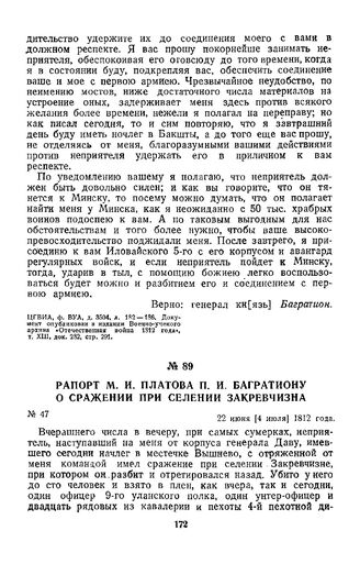 1812 г. 22 июня. Рапорт М. И. Платова П. И. Багратиону о сражении при селении Закревчизна // ЦГВИА, ф. ВУА, д. 3504, л. 191. Документ опубликован в издании Военно-ученого архива «Отечественная война 1812 года», т. XIII, док. 259, стр. 259.
