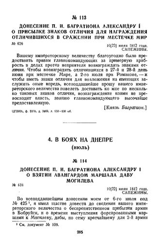 1812 г. 10 июля. Донесение П. И. Багратиона Александру I о присылке знаков отличия для награждения отличившихся в сражении при местечке Мир