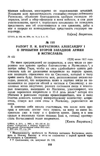 1812 г. 17 июля. Рапорт П. И. Багратиона Александру I о прибытии второй Западной армии в Мстиславль // ЦГВИА, ф. ВУА, д. 3469, л. 165-166 об. Документ опубликован в издании Военно-ученого архива «Отечественная война 1812 года», т. XIV, док. 157, стр. 156.
