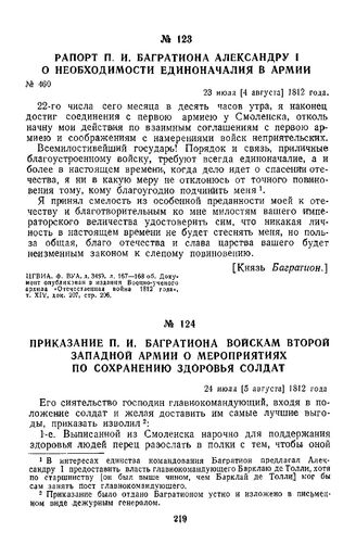 1812 г. 23 июля. Рапорт П. И. Багратиона Александру I о необходимости единоначалия в армии // ЦГВИА, ф. ВУА, д. 3489, л. 167-168 об. Документ опубликован в издании Военно-ученого архива «Отечественная война 1812 года», т. XIV, док. 207, стр. 206.