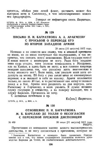 1812 г. 30 июля. Отношение П. И. Багратиона М. Б. Барклаю де Толли о несогласии с переменой прежней диспозиции // ЦГВИА, ф. ВУА, д. 3506, л. 298. Документ опубликован в издании Военно-ученого архива «Отечественная война 1812 года», т. XV, док. 277, стр. 281.