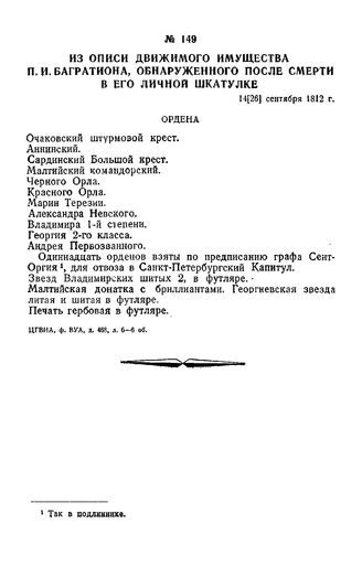 1812 г. 14 сентября. Из описи движимого имущества П. И. Багратиона, обнаруженного после смерти в его личной шкатулке
