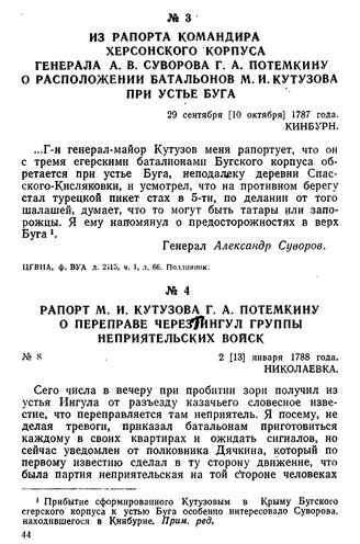 Из рапорта командира Херсонского корпуса генерала А. В. Суворова Г. А. Потемкину о расположении батальонов М. И. Кутузова при устье Буга. 29 сентября [10 октября] 1787 года, Кинбурн // ЦГВИА, ф. ВУА, д. 2415, ч. I, л. 66. Подлинник.