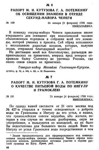 Рапорт М. И. Кутузова Г. А. Потемкину о качестве питьевой воды по Ингулу и Грамоклею. 24 января [4 февраля] 1788 года, Николаевка // ЦГВИА, ф. 52, д. 408, ч. III, л. 33. Подлинник.