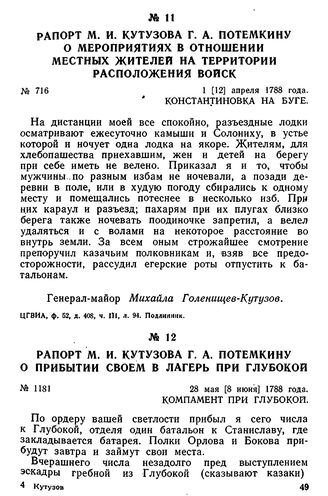 Рапорт М. И. Кутузова Г. А. Потемкину о мероприятиях в отношении местных жителей на территории расположения войск. 1 [12] апреля 1788 года, Константиновка на Буге // ЦГВИА, ф. 52, д. 408, ч. III, л. 94. Подлинник.