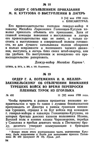 Ордер с объявлением приказания М. И. Кутузова о выступлении в лагерь. 3 [14] мая 1789 года, г. Елисаветград