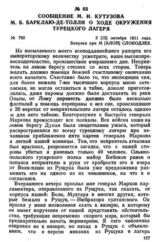 Сообщение М. И. Кутузова М. Б. Барклаю-де-Толли о ходе окружения турецкого лагеря. 3 [15] октября 1811 года, бивуаки при М[алой] Слободзее // ЦГВИА, ф. ВУА, д. 2952, л. 354—355. Подлинник.